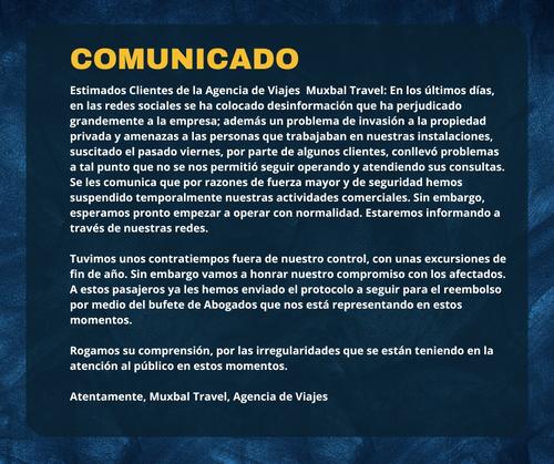 "Tuvimos contratiempos fuera de nuestro control, con excursiones de fin de año. Sin embargo, vamos a honrar a nuestro compromiso con los afectados. A estos pasajeros ya les hemos enviado el protocolo a seguir para el reembolso por medio del bufete de abogados que nos está representando en estos momentos", se asegura en el escrito.