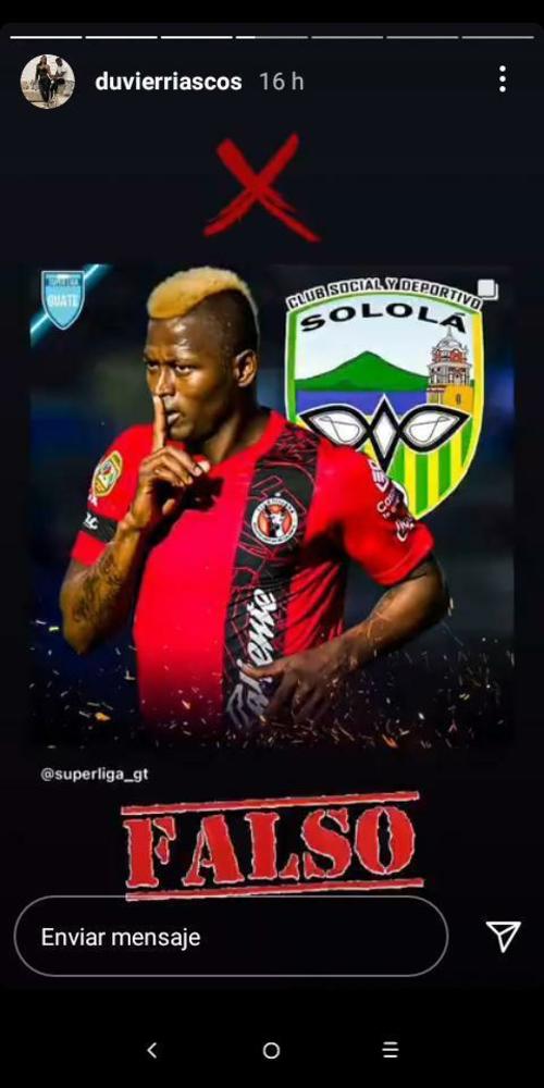 El pasado 31 de mayo el cuadro de Sololá FC confirmaba por medio de sus redes sociales la contratación del colombiano "Duvier Riascos", horas más tarde en su cuenta de instagram el jugador se encargó de desmentir el supuesto fichaje.