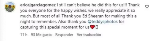 "Todavía no me puedo creer que haya hecho esto por nosotros. Gracias a todos por los felices deseos, realmente lo apreciamos mucho. Pero sobre todo gracias Ed Sheeran por hacer de esta una noche para recordar. Gracias también a TeddysPhotos por capturar este momento tan especial para nosotros", expresó Erica Garcia.