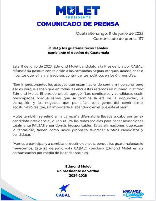 Tras ello, Mulet emitió un comunicado este domingo 11 de junio, en el que se defiende de las acusaciones y asegura que las mismas buscan favorecer a otros candidatos a la presidencia de Guatemala.