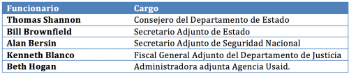 La delegación estadounidense era de alto nivel. Integrada por el Secretario Adjunto de Estado, Bill Brownfield; el Secretario Adjunto del Departamento de Seguridad Nacional, Alan Bersin; el Fiscal General Adjunto del Departamento de Justicia, Kenneth Blanco; y la Administradora Adjunta en funciones de la agencia de cooperación Usaid, Beth Hogan.