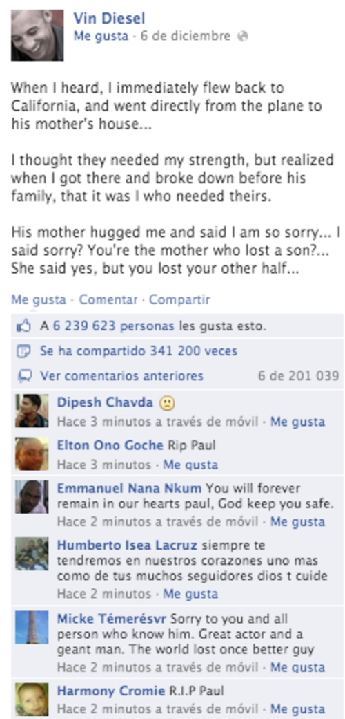 En dos días, este mensaje de Diesel posee más de 6 millones de likes, ha sido compartido 341 mil veces y ha acaparado los comentarios en las redes, que buscan animar al actor que había construido una larga y sólida amistad con Paul Walker.
