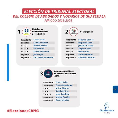 Mientras para el Tribunal Electoral se presentaron seis planillas con 42 candidatos, encabezadas por: Lester Flores, Federico Barrios, Francis Peña, Nancy Paiz, Teresita Medina y Manolo Zacarías.