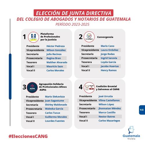 Para integrar la Junta Directiva, participan 56 candidatos a través de ocho planillas. Estas están encabezadas por: Héctor Pedroza, Mario Cano, Mario Siekavizza, José Urrutia, Benjamín López, Jazmín Orellana, Dumbar Harris y Juan Francisco Solórzano.