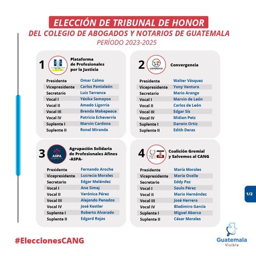 Para el Tribunal de Honor lo integran 63 candidatos en siete planillas. Encabezados por Omar Calmo, Walter Vásquez, Fernando Aroche, María Morales, Geisler Pérez, Ileana Hernández y Abhran Díaz.