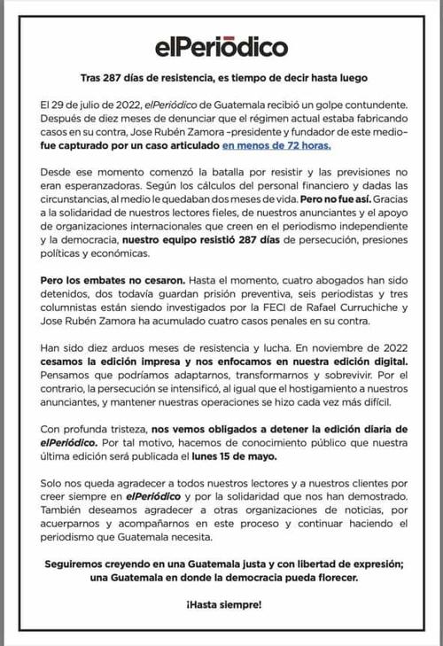 "Nuestro equipo resistió 287 días de persecución, presiones políticas y económicas... Los embates no cesaron. Hasta el momento cuatro abogados han sido detenidos, dos todavía guardan prisión preventiva, seis periodistas y tres columnistas están siendo investigados por la FECI, José Rubén Zamora ha acumulado cuatro casos penales en su contra", aseguran en el comunicado.