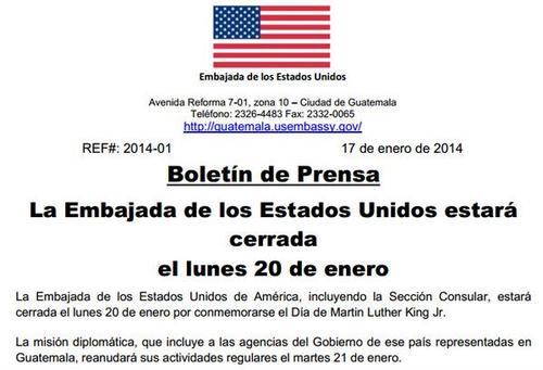 La Embajada de Estados Unidos en Guatemala no brindará atención al público, este lunes 20 de enero, por la conmemoración del nacimiento de Martin Luther King. Tanto la sección de atención a visas, como la de servicio consular permanecerán cerradas en esta fecha, reanundando labores el martes 21.