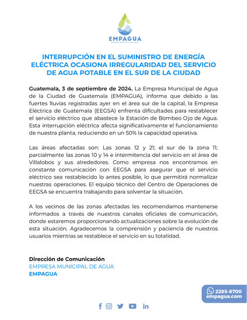 En esta mañana de martes 3 de septiembre, la Empresa Municipal de Agua de la Ciudad de Guatemala (Empagua) explicó que derivado a las fuertes lluvias de la noche del lunes 2 de septiembre, se registró un incidente en el servicio eléctrico que afectó la estación de bombeo "Ojo de agua".