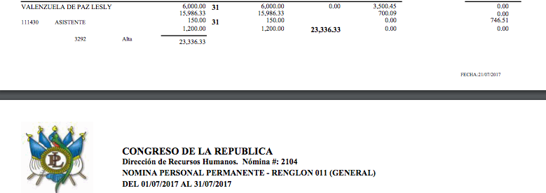 Desde noviembre de 2011, la nueva legisladora ocupó una plaza presupuestada (011) en el Organismo Legislativo en la que ganaba más de 23 mil quetzales al mes, casi lo mismo que ganará como diputada.