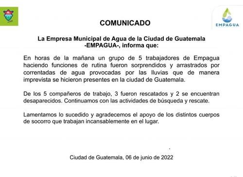 La Empresa Municipal de Agua de la Ciudad de Guatemala informó que de los cinco trabajadores que desaparecieron tras ser arrastrados por la corriente, dos aún permanecen desaparecidos.