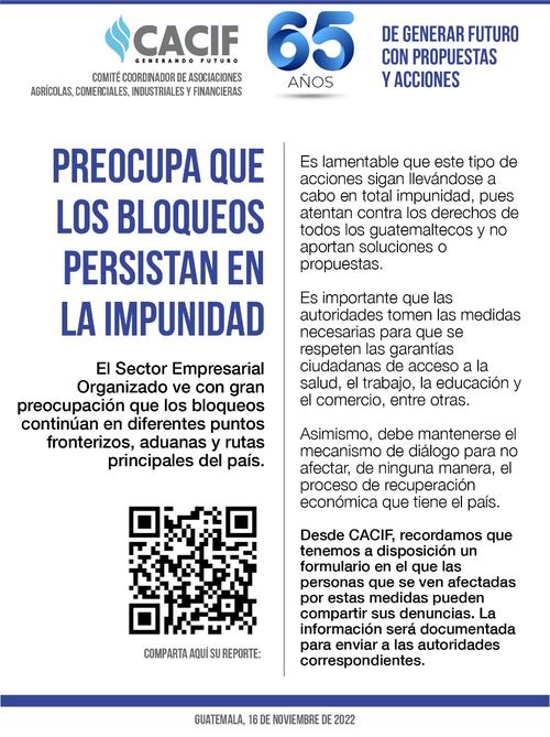 Mientras el Comité Coordinador de Asociaciones Agrícolas, Comerciales, Industriales y Financieras, (CACIF), también expresó su preocupación por los impactos que generan este tipo de bloqueos.