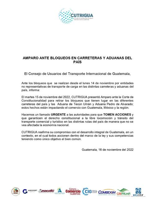 "Rechazamos cualquier medida de hecho que violente los derechos de libertad de locomoción, salud, libertad de industria, libre tránsito de mercancías, hacemos un llamado a las autoridades para que garanticen el derecho de los guatemaltecos", concluyeron.