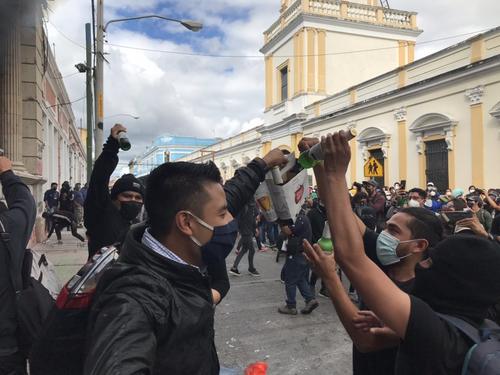 Los manifestantes sacaron las botellas y las rompieron frente al Palacio Legislativo.