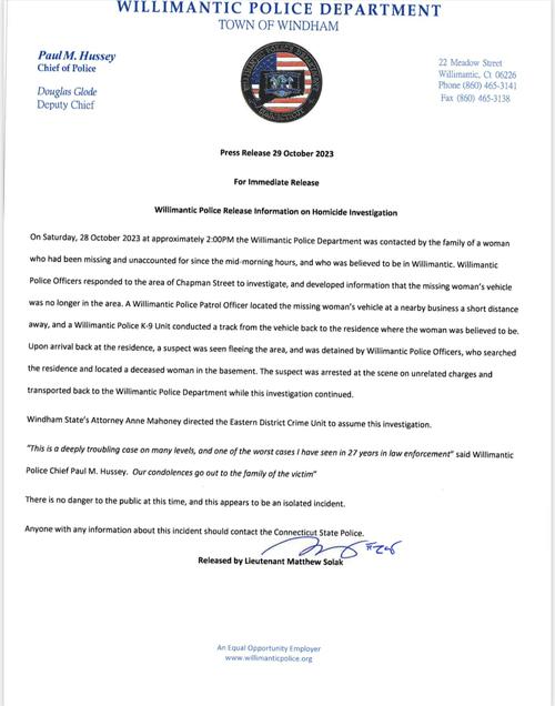 "Este es un caso profundamente preocupante en muchos niveles, y uno de los peores casos que he visto en 27 años en el cumplimiento de la ley. Nuestro más sentido pésame para la familia de la víctima", expresó el jefe de policía de Willimantic, Paul M. Hussey, en un comunicado.