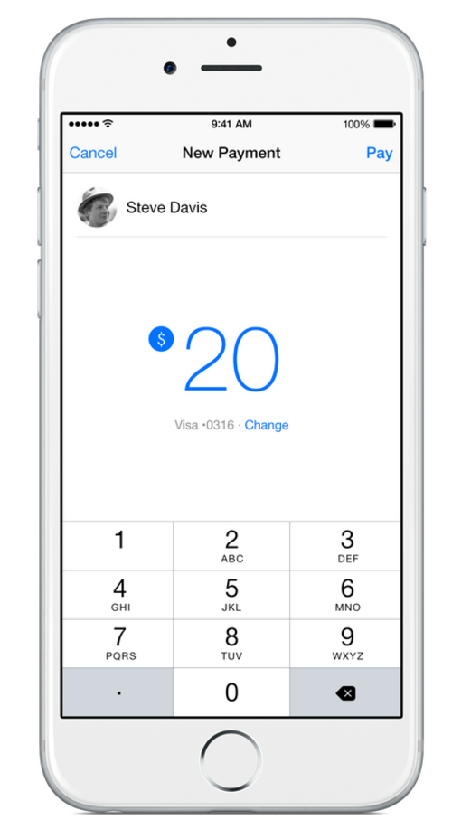 Tocar el icono de pago en la parte superior derecha y añadir su tarjeta de débito para enviar el dinero.
