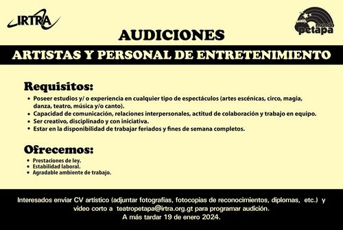 Toma en cuenta que debes enviar tu CV artístico con fotografías, fotocopia de reconocimientos, diplomas y un video corto al correo: teatropetapa@irtra.org.gt a más tardar el 19 de enero.