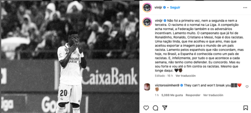 "No era la primera vez, ni la segunda, ni la tercera. El racismo es normal en LaLiga. La competición piensa que es normal, lo mismo la Federación y los rivales lo alientan", afirmó el jugador brasileño en sus redes sociales.