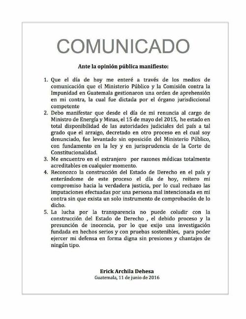 El exministro de Energía y Minas, Erick Archila está prófugo de la Justicia. Sin embargo, envió un comunicado en el que asegura que se encuentra fuera del país por razones médicas pero, en el escrito, no explica si está dispuesto a entregarse a las autoridades, ni revela donde está.