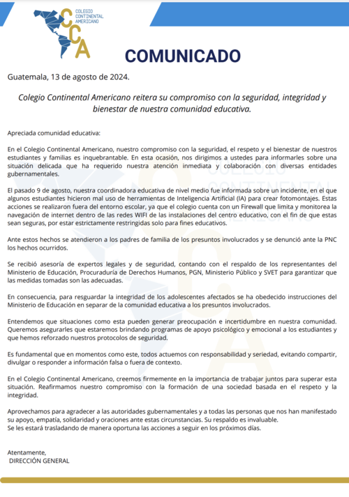 "En el que algunos estudiantes hicieron mal uso de herramientas de Inteligencia Artificial para crear fotomontajes. Estas acciones se realizaron fuera del entorno escolar, ya que el colegio cuenta con un Firewall que limita y monitorea la navegación de internet dentro de las redes WIFI de las instalaciones del centro educativo", explicó el centro educativo.