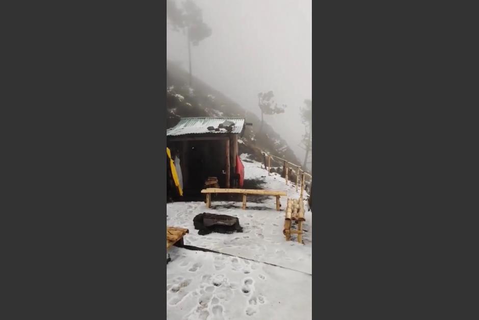 "Se registró caída de granizo en el área conocida como las plataformas, dónde es área de acampar de los turistas". En ese lugar se logró apreciar el granizo disperso en el las faldas del volcán Acatenango.