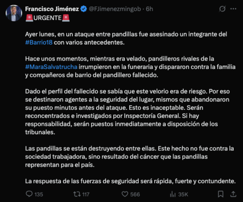 El ministro de Gobernación, Francisco Jiménez, informó que el atentado fue producto de un enfrentamiento entre pandillas rivales.