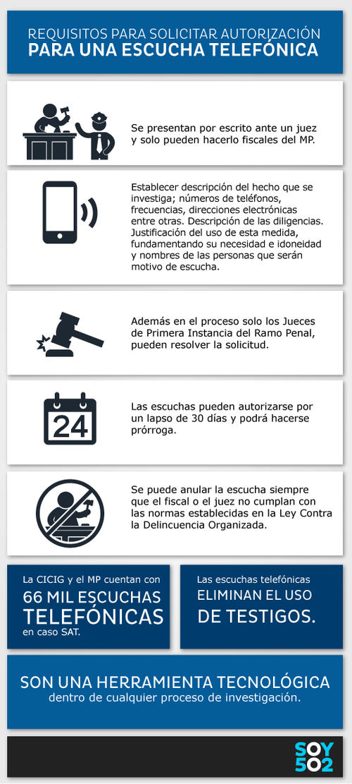 Las escuchas telefónicas que utilizó el Ministerio Público (MP) y la Comisión Internacional Contra la Impunidad en Guatemala (CICIG), en el caso que se sigue por defraudación aduanera en la Superintendencia de Administración Tributaria (SAT), son fundamentales porque se elimina la "prueba reina" del testimonio, afirman abogados consultados.