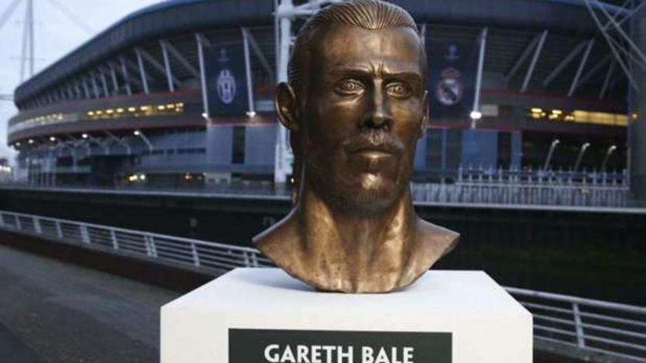 Así se ve la escultura de Bale en la ciudad de Cardiff.
