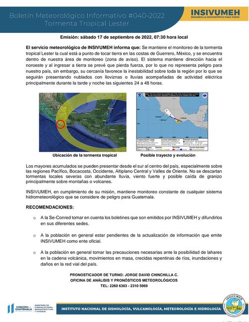 Instituto Nacional de Sismología, Vulcanología, Meteorología e Hidrología (Insivumeh) describe que la tormenta tropical Lester está a punto de tocar tierra en las costas de Guerrero, México y se encuentra dentro de la zona de monitoreo guatemalteco.