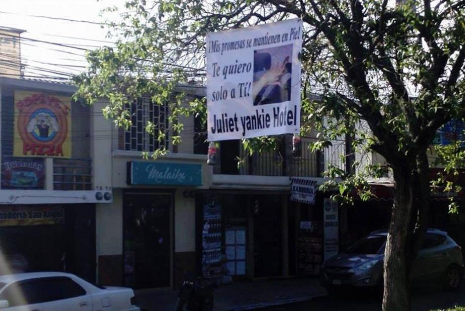 Un usuario en redes sociales compartió con Soy502 unas fotografías de una manta colocada en el bulevar principal de la colonia San Ángel, zona 6. En la misma se lee “¡Mis promesas se mantienen en pie!... Te quiero solo a ti”.