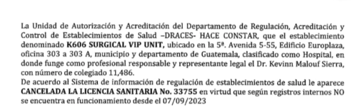 "El establecimiento denominado K606 Surgical VIP Unit, ubicado en la 5ta avenida 5-55 Edificio Europlaza, oficinas 303 y 303A, clasificado como hospital, en donde funge como profesional responsable y representante legal el Dr. Kevin Malouf Sierra, le aparece cancelada la licencia sanitaria 33755 en virtud que según registros internos No se encuentra en funcionamiento desde el 07 de septiembre de 2023", dijo el Ministerio de Salud.