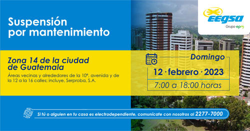 Este domingo 12 de febrero algunas zonas de la Ciudad Capital permanecerán sin servicio eléctrico. La empresa Eléctrica (Eegsa) informa que se estarán realizando trabajos de mantenimiento, por lo que han tenido que suspender el servicio.