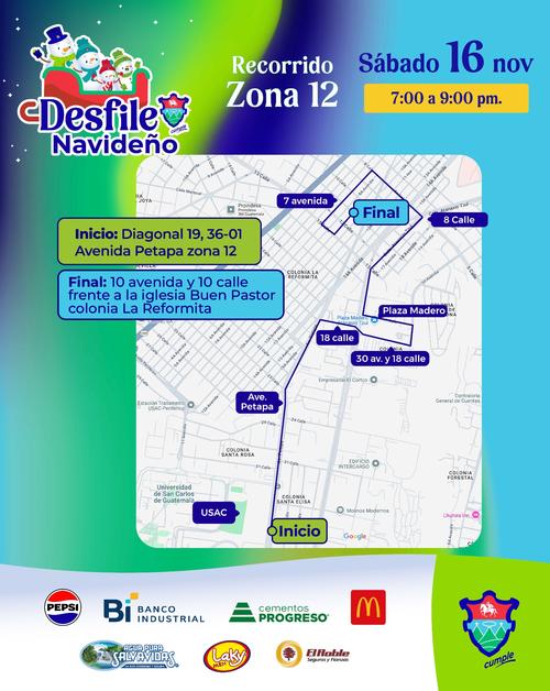El recorrido iniciará en la diagonal 19 de la avenida Petapa zona 12 a las 19:00 horas, luego las carrozas navideñas se desplazarán sobre la avenida Petapa hasta la 18 calle en donde cruzarán hacia la calzada Atanasio Tzul.