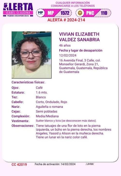 Tras intentar localizarla pero no obtener respuesta, se activó una alerta Isabel-Claudina en la que se detalla que la madre guatemalteca desapareció en la colonia Monseñor Gerardi, zona 21 capitalina.
