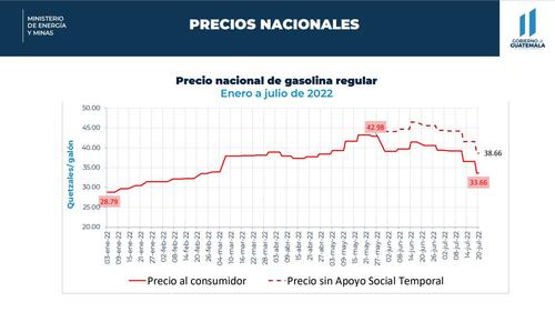 Actualmente se encuentra vigente un subsidio de Q5 por cada galón de gasolina superior y regular. Mientras que Q.7 por cada galón de diésel, el cuál finalizará el próximo 4 de agosto, según la Ley de Apoyo Temporal a los consumidores de diésel y gasolina regular.