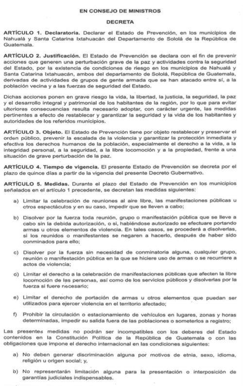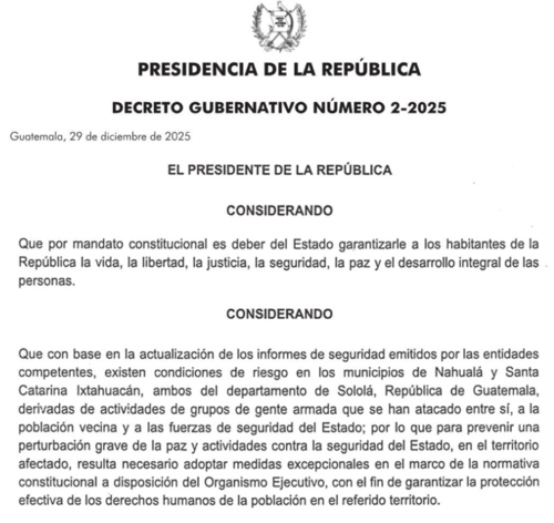 Este martes 30 de diciembre, el Diario de Centro América publicó el Decreto 2-2025, el cual afirma que el Estado de Prevención declarado por el presidente Bernardo Arévalo, en los municipios de Nahualá y Santa Catarina Ixtahuacán, de Sololá, se extenderá por 15 días más.