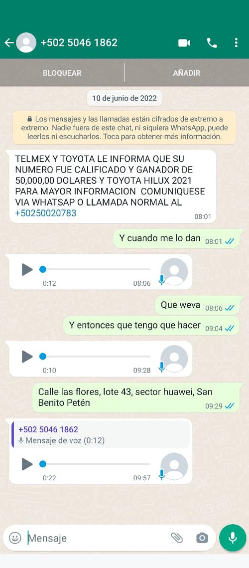 Un seguidor de Soy502 sí lo hizo y por curiosidad se puso en contacto con uno de los números de donde recibió el mensaje donde señalaban que se había ganado un vehículo y 50,000 dólares.