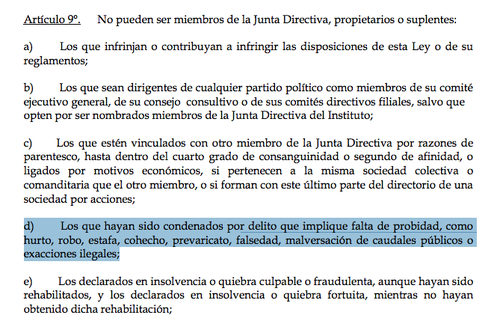 Otto Pérez pudo pedir la salida de Juan de Dios Rodríguez, pero parece haberse amparado en el artículo 11 de la Ley Orgánica del IGSS, que remite al artículo 9, para no hacerlo. En ella, se explica que la salida se podrá dar si es condenado por “delito que implique falta de probidad como hurto, estafa, cohecho, prevaricato, falsedad,malversación de caudales públicos o exacciones ilegales“.