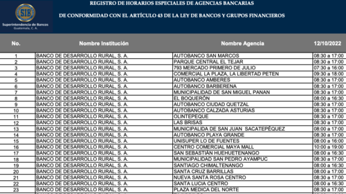 La Superintendencia de Bancos de Guatemala (SIB) publicó un listado de agencias que atenderán este 12 de octubre.