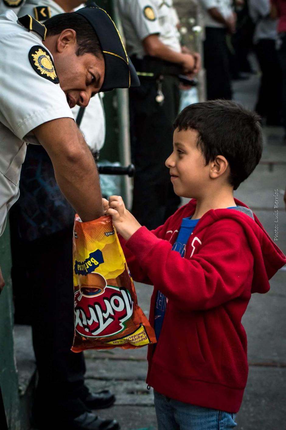 Un niño comparte una bolsa de frituras con un agente de la PNC. (Foto: Luis Berríos)