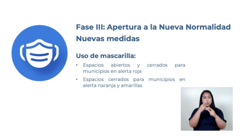 Sin embargo, el uso de mascarilla protectora continuará en espacios abiertos y cerrados en los municipios que se encuentren en color rojo.