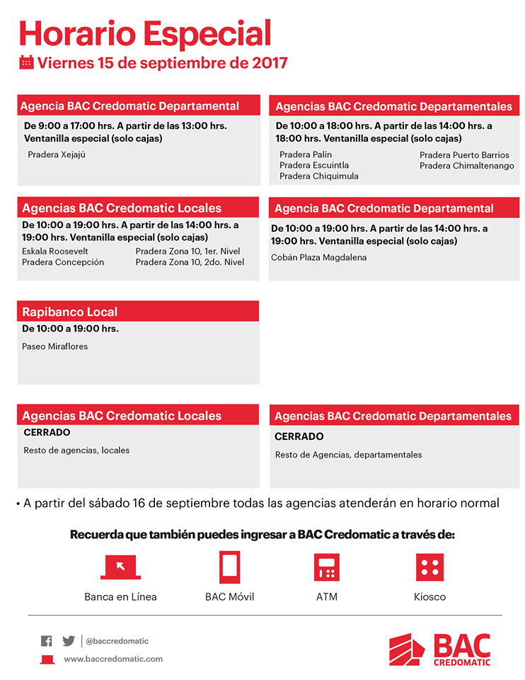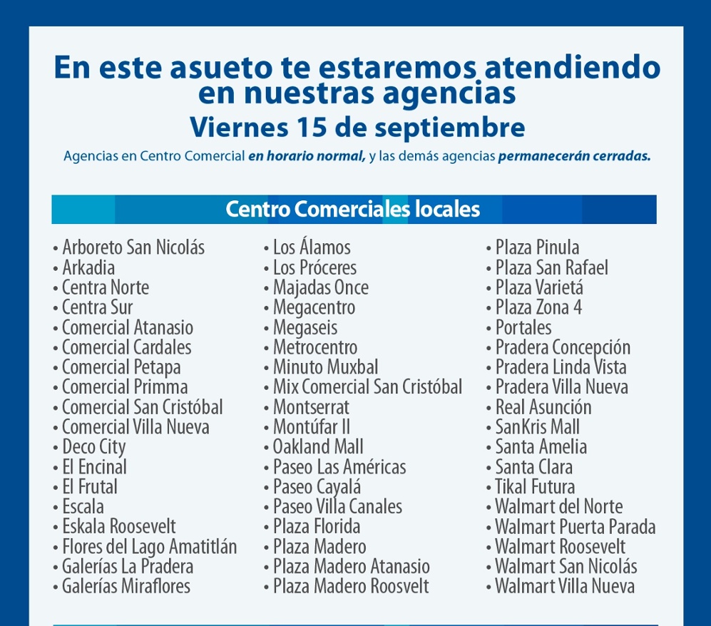 El asueto por el aniversario de la independencia de Guatemala coincide con una fecha de pago en miles de empresas. Sin embargo, la Junta Monetaria autorizó a los bancos a cerrar sus instalaciones este día y prestar sus servicios como consideren conveniente.