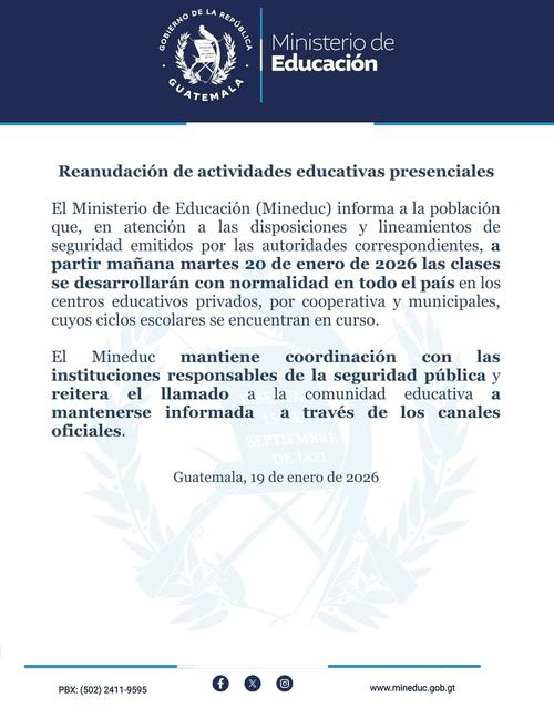 "En atención a las disposiciones y lineamientos de seguridad emitidos por las autoridades correspondientes, a partir mañana martes 20 de enero de 2026 las clases se desarrollarán con normalidad en todo el país en los centros educativos privados, por cooperativa y municipales, cuyos ciclos escolares se encuentran en curso", dice el comunicado.