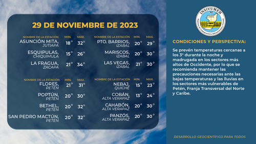 Ante ello, se recomienda mantener las precauciones necesarias por las bajas temperaturas y las lluvias en las regiones más vulnerables de Petén, Franja Transversal del Norte y Caribe.
