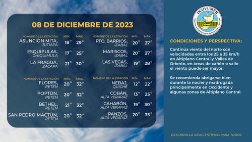 Para este viernes 8 de diciembre, el Instituto Nacional de Sismología, Vulcanología, Meteorología e Hidrología (Insivumeh) da a conocer que persiste la influencia de sistema de alta presión del norte al centro del país.