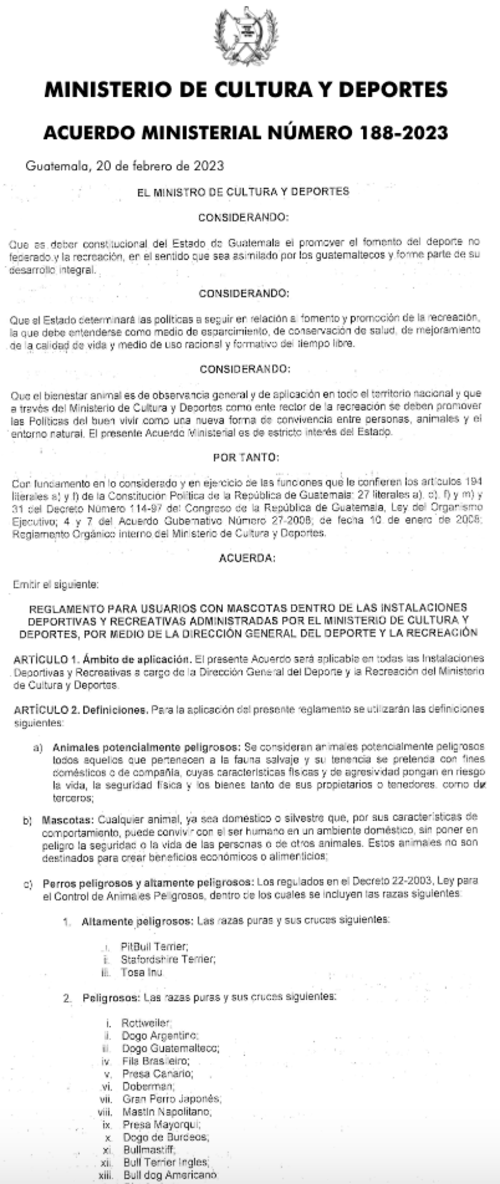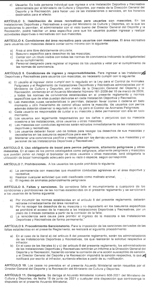 En el Diario Oficial, este viernes 24 de febrero fue publicado el Acuerdo Ministerial Número 188-2023 del Ministerio de Cultura y Deportes, en el que se da a conocer el Reglamento para Usuarios con Mascotas dentro de las Instalaciones Deportivas y Recreativas.