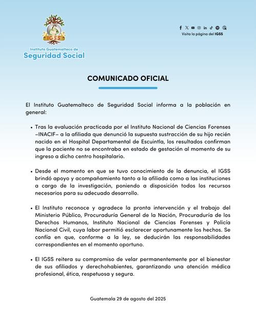 Mientras tanto, el IGSS emitió un comunicado en el que explicó que los resultados confirmaron que la paciente no se encontraba en estado de gestación al momento de su ingreso a dicho centro hospitalario.
