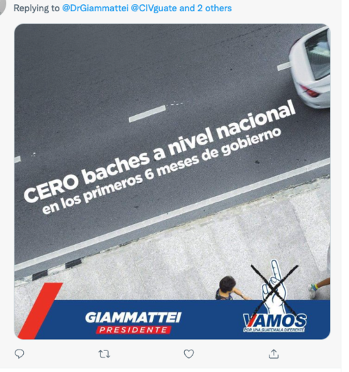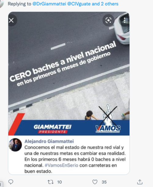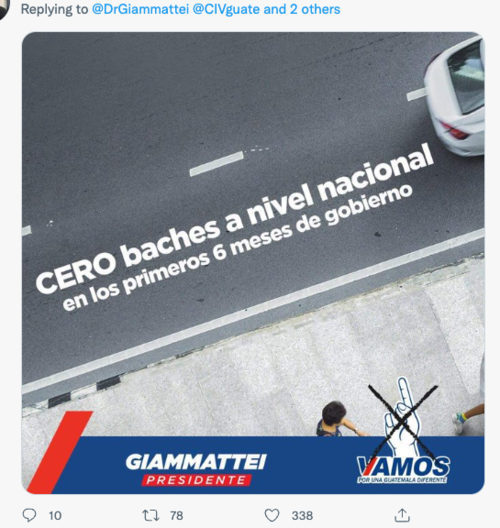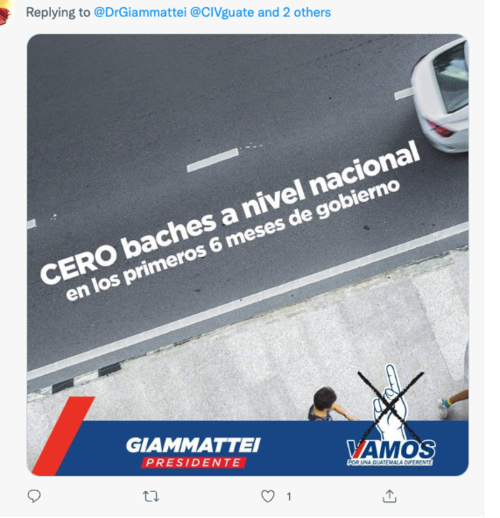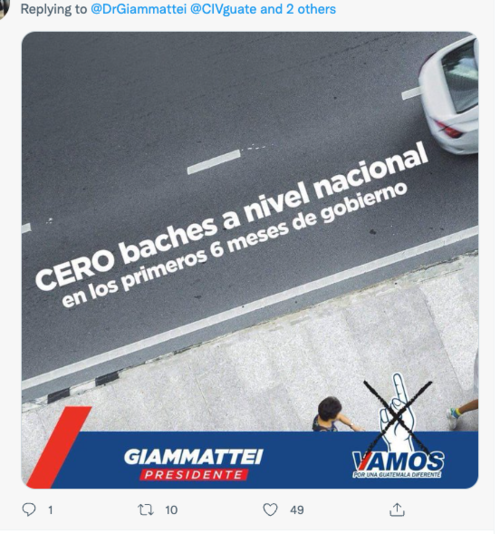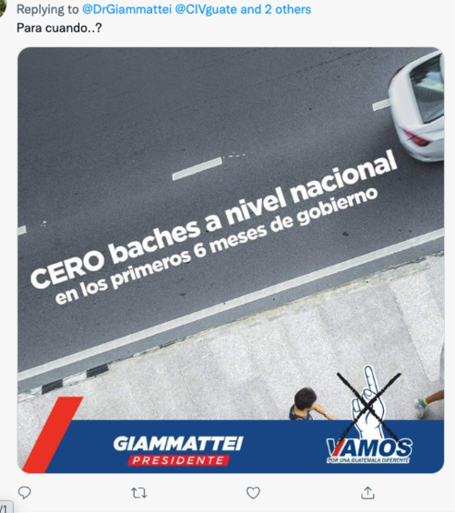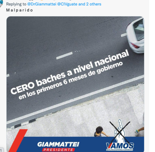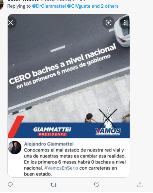 Mientras otros usuarios coincidieron en mandarle un mensaje breve y contundente. Se trata de la foto de unos de los afiches de campaña de Giammattei cuando, con tal de ganar votos lanzo una serie de promesas, una de ellas: "Cero Baches", un ofrecimiento para dejar en óptimas condiciones la red vial del país. Promesa aún no cumplida por el presidente.