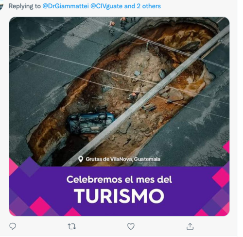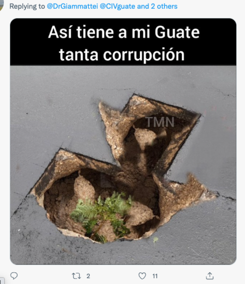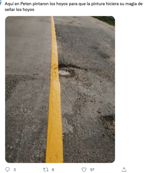 Mientras otros, le mandaron fotos de los hoyos que hay en las calles de sus comunidades. Y es que desde el inicio de la gestión de Giammattei a la actualidad, la infraestructura del país se ha visto altamente afectada. La Coordinadora Nacional para la Reducción de Desastres (Conred) ha contabilizado 584 carreteras afectadas, 10 destruidas, 91 fuentes afectados y 32 destruidos, entre otros incidentes causados por las lluvias y se lamenta la pérdida de 44 personas.