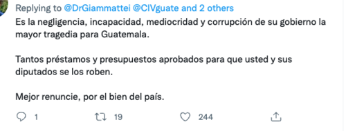 Las reacciones de los internautas no se hicieron esperar y la molestia de muchos fue expresada con diversos mensajes. Uno de los usuarios le dijo "Es la negligencia, incapacidad, mediocridad y corrupción de su gobierno la mayor tragedia para Guatemala. Tantos préstamos y presupuestos aprobados para que usted y sus diputados se los roben. Mejor renuncie, por el bien del país."