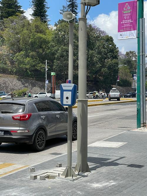 Los botones están instalados sobre la vía pública, están sobre un poste que a lo alto tiene un altoparlante y en medio se encuentra la caja con el nombre "emergency"